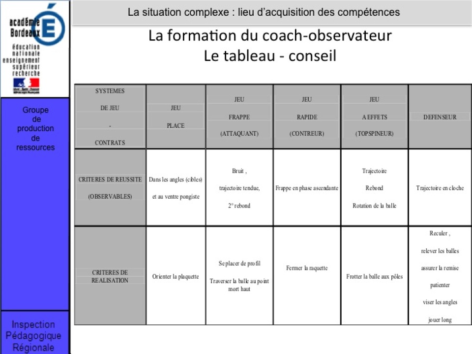 Rechercher le gain d'une rencontre en construisant le point, dès la mise en jeu, pour rompre l'échange par des frappes variées en vitesse et en direction, et en utilisant les premiers effets sur la balle notamment au service. Gérer collectivement un tournoi et aider un partenaire à prendre en compte son jeu pour gagner la rencontre